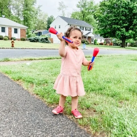latex balloons + balloon air pump: we blow up balloons weekly and incorporate them in indoor and outdoor play (balloon shuttle races, matching, and don’t let the balloon drop). I have this exact pump and love it.